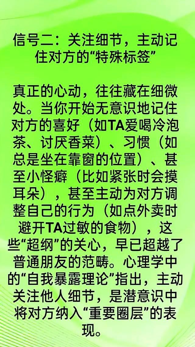最近网友热议的“日久生情五大信号”太真实了,尤其是第三点——当TA开始管你熬夜喝酒吃外卖,嘴上嫌弃心里早把你当未来对象了。